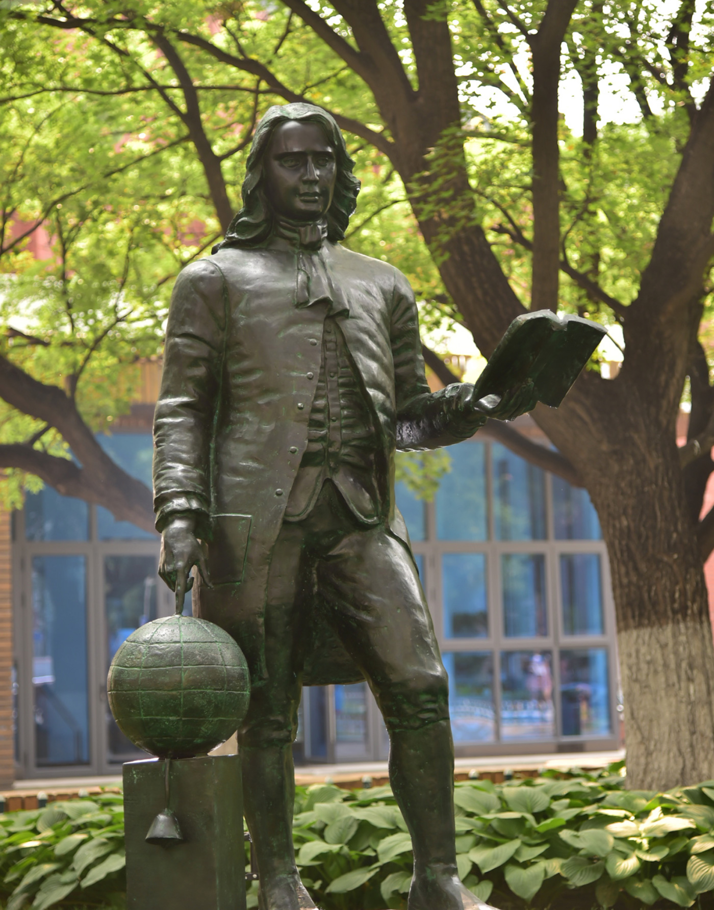牛顿铜像——位于学生活动中心和学生发展中心前的长方形草坪中心,2017年6月由伦敦玛丽女王大学向北京邮电大学建赠,铜像采用“行走式”的动感风格,表达了与时俱进的科学品格。