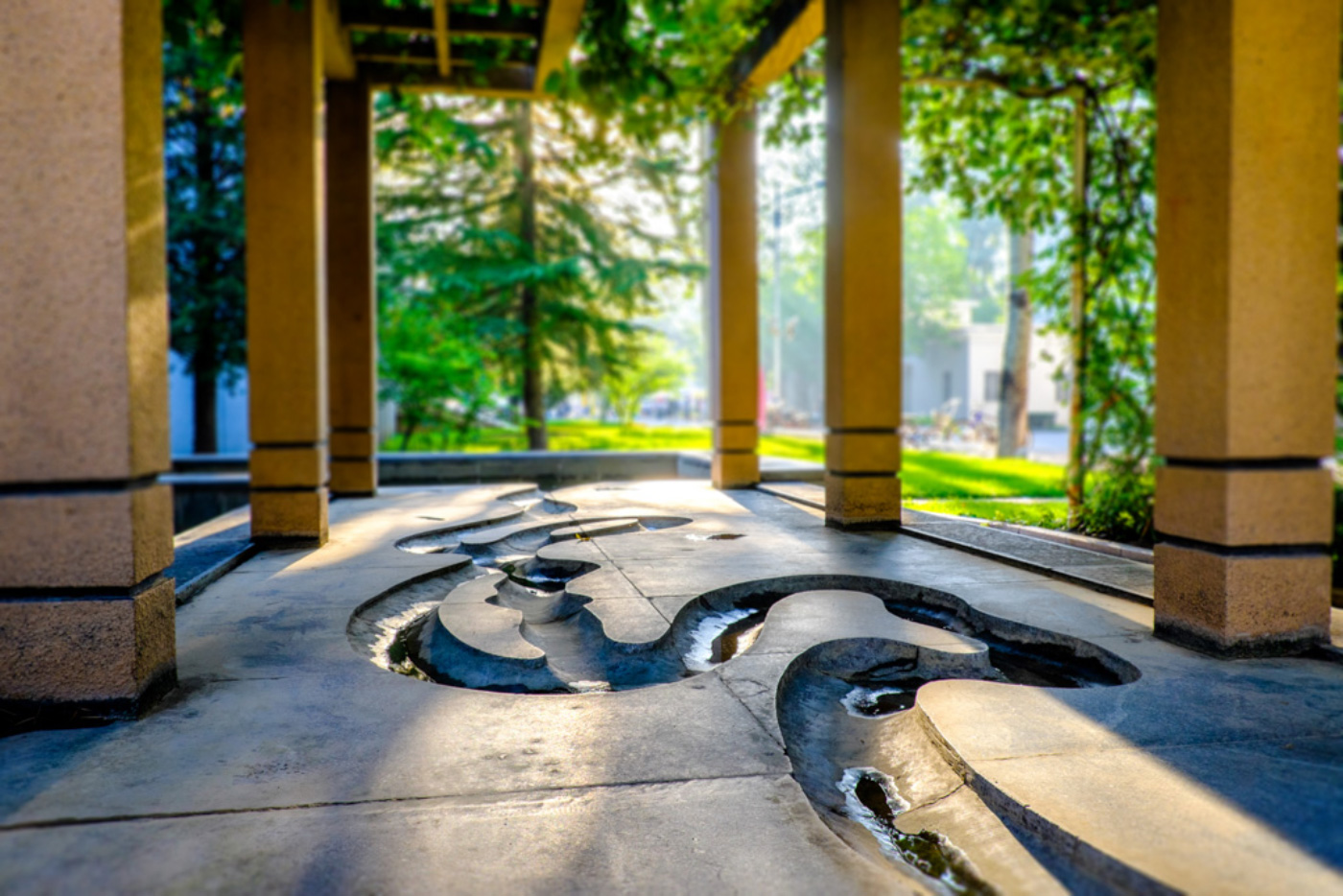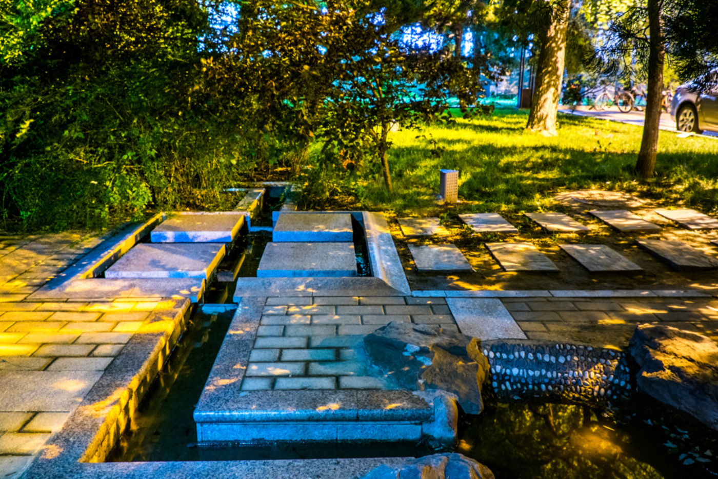 邮-“邮”字位于时光广场景区花架下,曲水流觞的走向形成一个篆体的北邮的“邮”字。